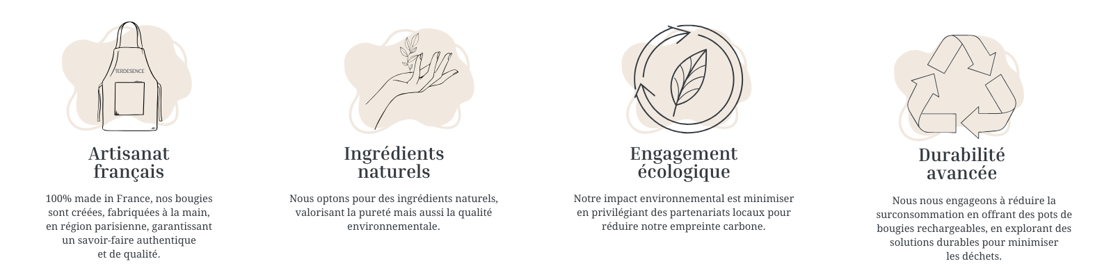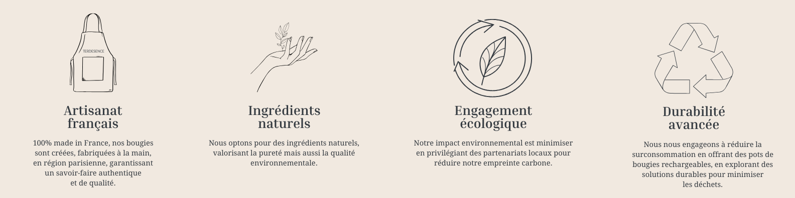Chaque bougie Terdesence, fabriquée en France, vous invite à un voyage intérieur vers la tranquillité, en harmonisant votre espace avec des parfums subtils et raffinés